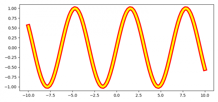 import numpy as np from matplotlib import pyplot as plt plt.rcParams["figure.figsize"] = [7.50, 3.50] plt.rcParams["figure.autolayout"] = True x = np.linspace(-10, 10, 100) y = np.sin(x) plt.plot(x, y, lw=10, color='red') plt.plot(x, y, lw=5, color='yellow') plt.show()