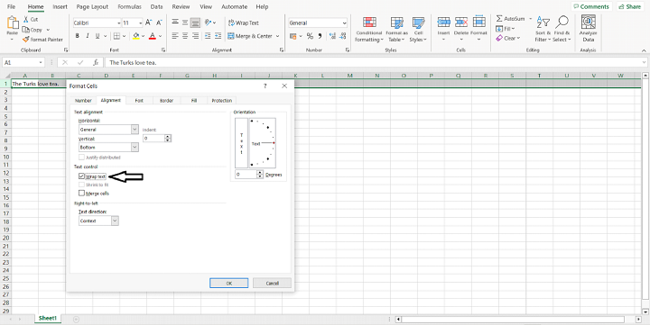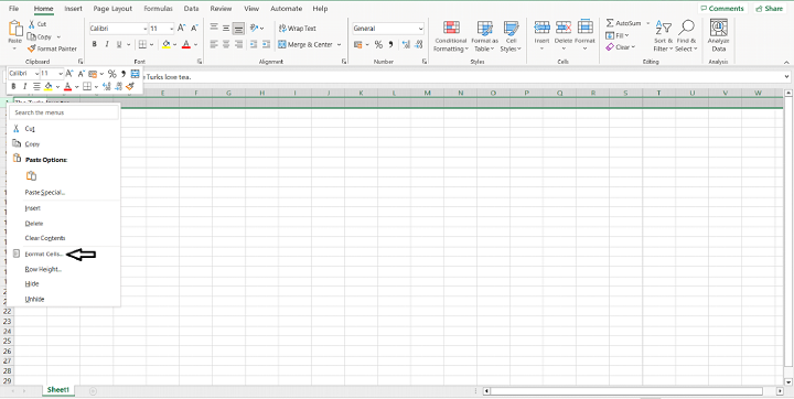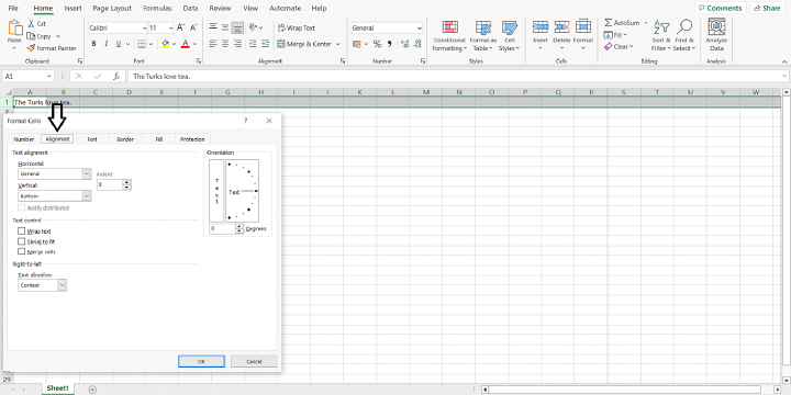 要格式化选定的单元格,请右键单击它们并从结果菜单中选择“设置单元格格式”。或者,您可以通过单击“开始”选项卡的“对齐方式”子选项卡上的“格式”旁边的箭头来格式化单元格。