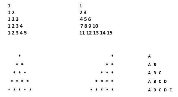 所有这些图案都可以借助 for 循环来打印,修改后的 print 语句会形成这些不同的图案。