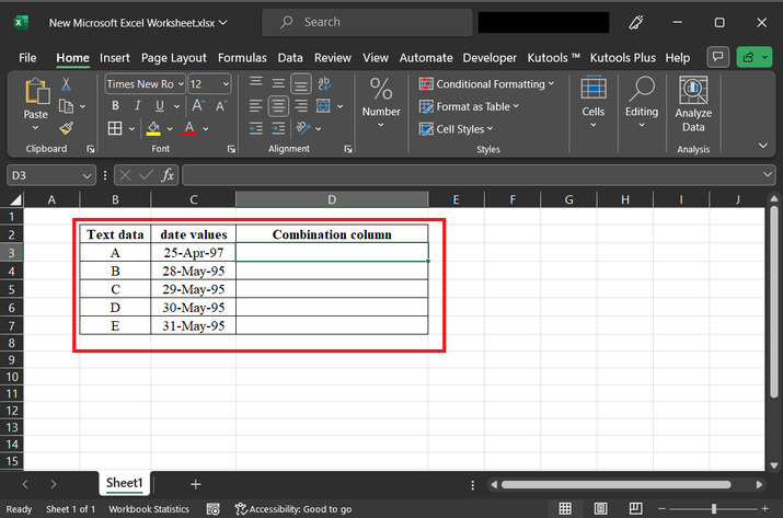 有时,当用户处理大型数据集时,会涉及文本和日期的使用。另一个重要的任务是将这两个元素合并到同一个单元格中。Excel 提供了简单有效的方法来轻松合并文本和日期值。在本文中,用户需要探索不同的技巧和公式,这些技巧和公式将允许用户快速无缝地在 Excel 中合并文本和日期值。第一个示例使用用户定义的公式来组合数据和文本值。而第二个示例允许用户使用 kutools。