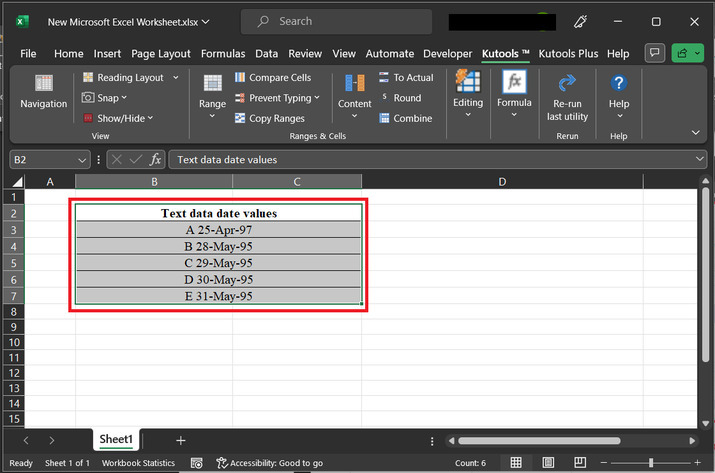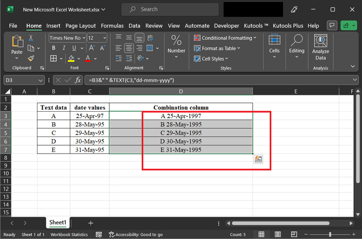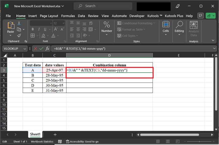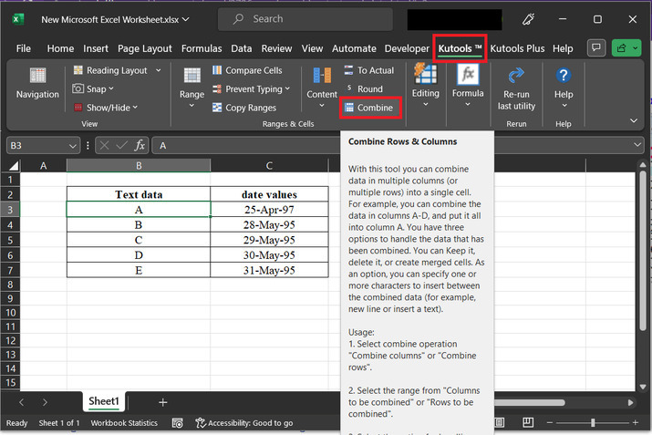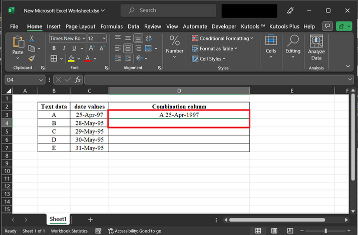 示例 2:使用 Excel 中的 kutools 将文本和日期合并到同一个单元格中。