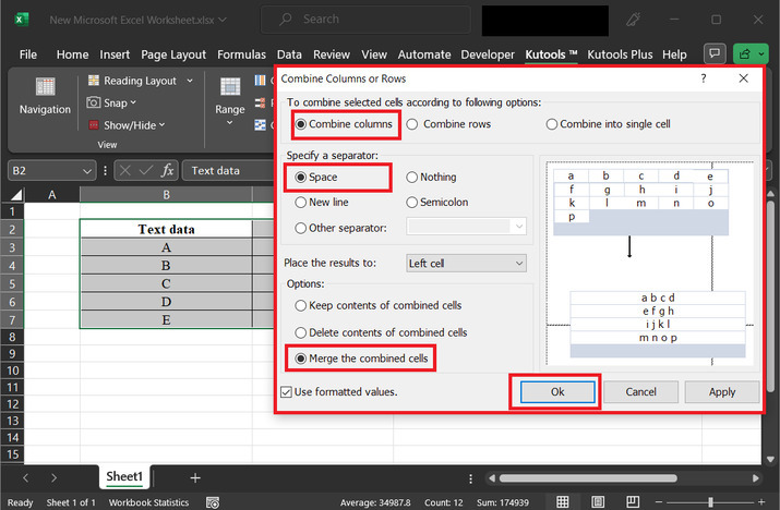 上述步骤将显示一个对话框“合并列或行”。在打开的对话框中,单击“合并列”按钮。在“指定分隔符”标签中,单击“空格”按钮。之后在选项区域中,单击“合并合并单元格”选项。之后单击“确定”按钮。