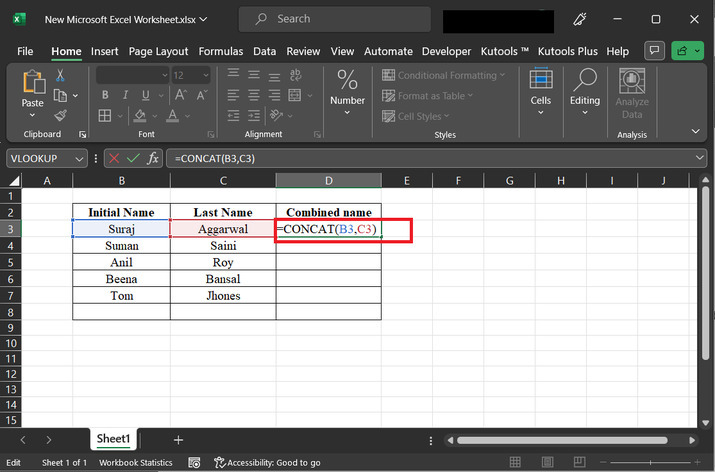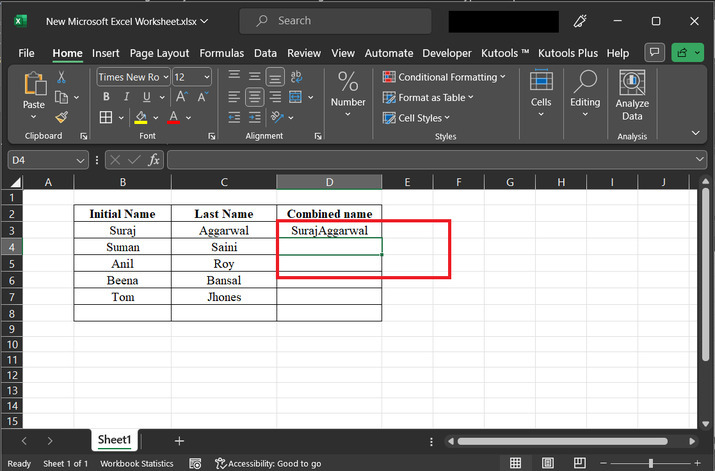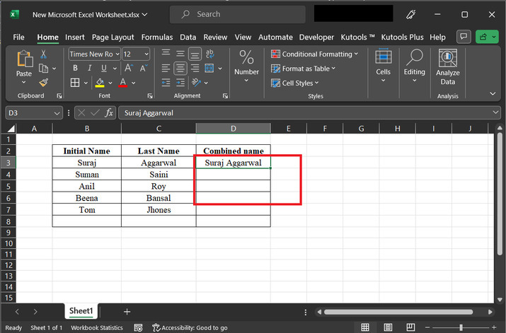 在“合并列”单元格中,键入如下所示的完整名称输出。对于此示例,名字是“Suraj”,姓氏是“Aggarwal”,在合并输出列中写入数据为“Suraj Aggarwal”。
