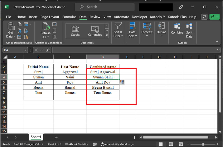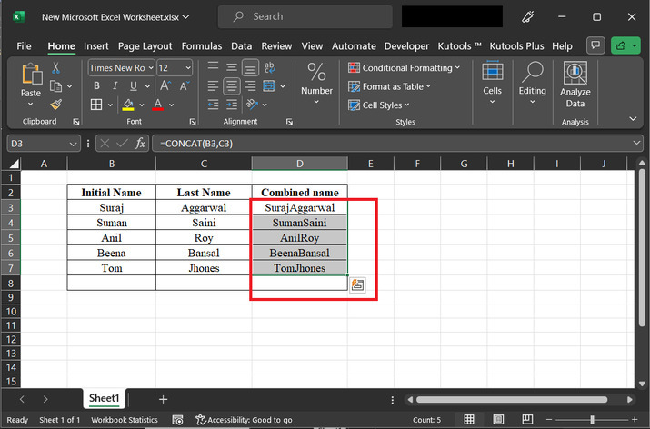 需要注意的是,快速填充功能允许用户使用以前的数据值生成新值。因此,为了获得更准确的结果,用户需要提供两到三个样本。接下来的示例描述了使用kutools合并两列。这里另一个需要注意的重要点是,kutools允许用户在添加数据时插入空格、逗号、分隔符等等。要获得更清晰的信息,请参考本教程的第三个示例。