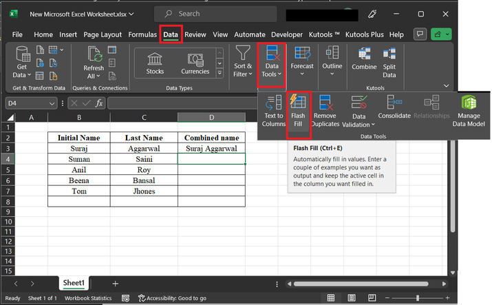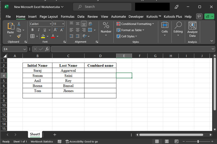 在处理大型数据集时,有时用户会发现人员的姓名和姓氏存储在不同的列中。但是,为了处理信息,需要合并姓名或全名。对于这种情况,用户需要将两列中的数据添加到一列中。本文简要介绍了执行此相同任务的三个常见示例。第一个示例允许用户使用concat()函数来完成相同的任务。第二个示例允许用户使用快速填充功能来填写其余名称。