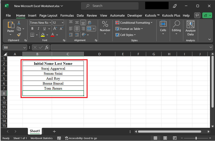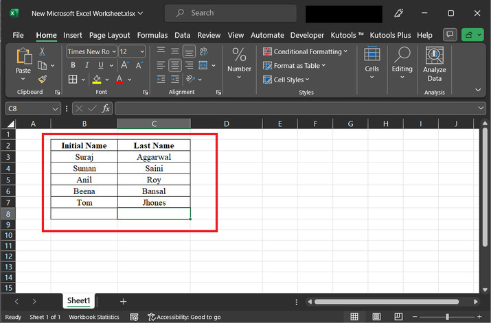 请考虑以下提供的Excel电子表格。打开的Excel表格包含两列。这里,第一列包含名字,姓氏列包含姓氏。