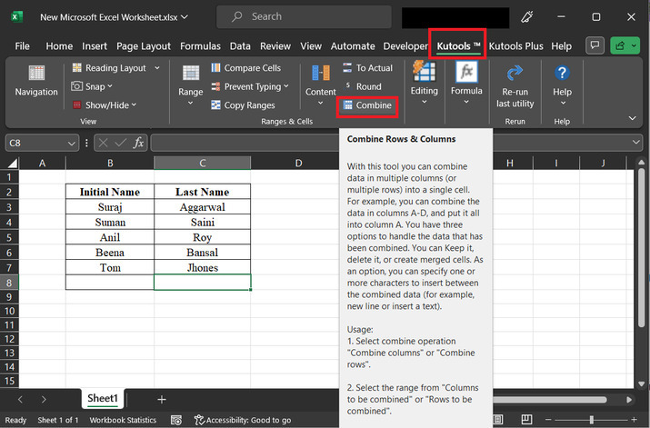 示例3:使用Excel中的Kutools将名字和姓氏合并到同一个单元格中