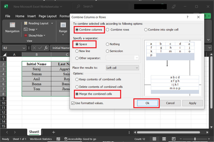 上述步骤将打开一个“合并列或行”对话框。在打开的对话框中,单击第一个单选按钮“合并列”。在第二个标签“指定分隔符”中,单击“空格”单选按钮。在选项标签中,单击“合并合并单元格”选项。最后,单击“确定”按钮。