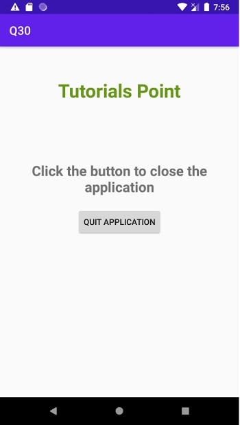 <?xml version="1.0" encoding="utf-8"?> <RelativeLayout xmlns:android="http://schemas.android.com/apk/res/android" xmlns:tools="http://schemas.android.com/tools" android:layout_width="match_parent" android:layout_height="match_parent" android:padding="4dp" tools:context=".MainActivity"> <TextView android:layout_width="wrap_content" android:layout_height="wrap_content" android:layout_centerHorizontal="true" android:layout_marginTop="50dp" android:text="Tutorials Point" android:textAlignment="center" android:textColor="@android:color/holo_green_dark" android:textSize="32sp" android:textStyle="bold" /> <TextView android:layout_width="wrap_content" android:layout_height="wrap_content" android:layout_above="@+id/button" android:layout_centerInParent="true" android:layout_marginBottom="20dp" android:text="Click the button to close the application" android:textAlignment="center" android:textSize="24sp" android:textStyle="bold" /> <Button android:id="@+id/button" android:layout_width="wrap_content" android:layout_height="wrap_content" android:layout_centerInParent="true" android:onClick="quitApp" android:text="QUIT APPLICATION" android:textAlignment="center" /> </RelativeLayout>