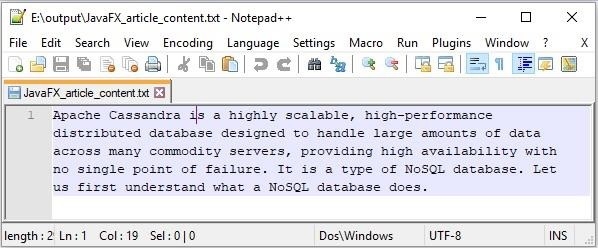 Connection established...... Record inserted...... Name: JavaFX Clob value: com.mysql.jdbc.Clob@18ef96 Blob value: com.mysql.jdbc.Blob@6956de9 Clob data is stored at: E:\output\JavaFX_article_content.txt Blob data is stored at: E:\output\JavaFX_article_logo.jpg