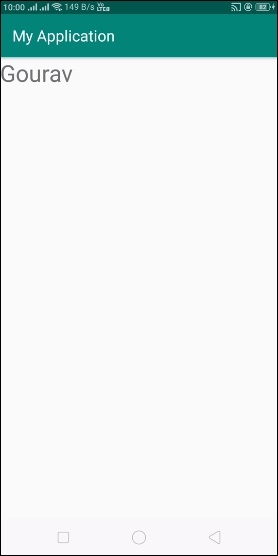 <?xml version="1.0" encoding="utf-8"?> <LinearLayout xmlns:android="http://schemas.android.com/apk/res/android" xmlns:app="http://schemas.android.com/apk/res-auto" xmlns:tools="http://schemas.android.com/tools" android:layout_width="match_parent" android:gravity="center" android:layout_height="match_parent" tools:context=".MainActivity"> <TextView android:id="@+id/text" android:textSize="30sp" android:layout_width="match_parent" android:layout_height="match_parent" /> </LinearLayout>