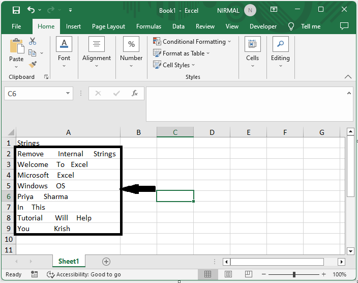 假设您有一个 Excel 表格,其中单元格中包含内部空格,类似于下图所示。