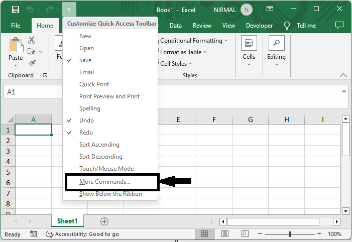考虑任何Excel工作簿。首先,单击箭头标记并选择“更多命令”。