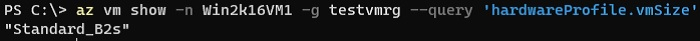 PS C:\> az vm show -n Win2k16VM1 -g testvmrg --query 'hardwareProfile.vmSize'