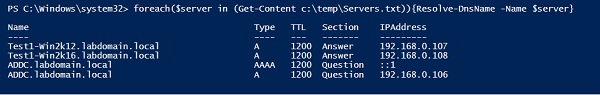 foreach($server in (Get-Content c:\temp\Servers.txt)){Resolve-DnsName -Name $server}输出