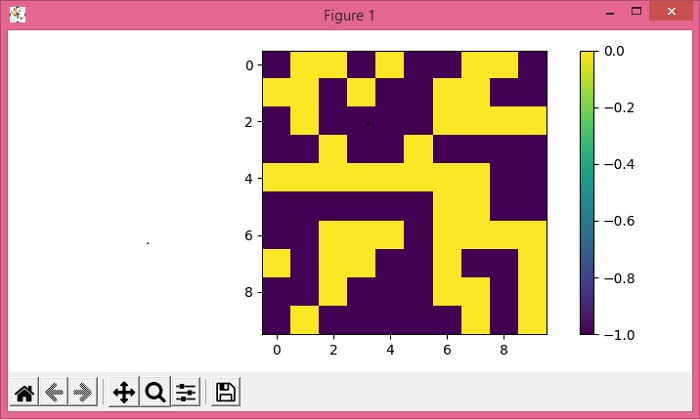 import numpy as np from matplotlib import pyplot as plt plt.rcParams["figure.figsize"] = [7.00, 3.50] plt.rcParams["figure.autolayout"] = True data = np.random.randint(-1, 1, (10, 10)) im = plt.imshow(data, interpolation="nearest") cbar = plt.colorbar(im) plt.show()