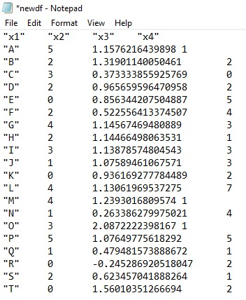 set.seed(111) x1<-LETTERS[1:20] x2<-sample(0:5,20,replace=TRUE) x3<-rnorm(20,1,0.40) x4<-rpois(20,3) df<-data.frame(x1,x2,x3,x4) df