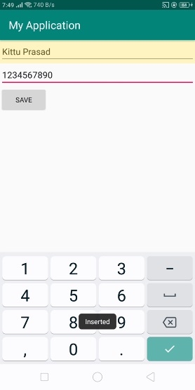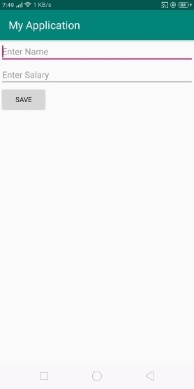 <?xml version = "1.0" encoding = "utf-8"?> <LinearLayout xmlns:android = "http://schemas.android.com/apk/res/android" xmlns:tools = "http://schemas.android.com/tools" android:layout_width = "match_parent" android:layout_height = "match_parent" tools:context = ".MainActivity" android:orientation = "vertical"> <EditText android:id = "@+id/name" android:layout_width = "match_parent" android:hint = "Enter Name" android:layout_height = "wrap_content" /> <EditText android:id = "@+id/salary" android:layout_width = "match_parent" android:inputType = "numberDecimal" android:hint = "Enter Salary" android:layout_height = "wrap_content" /> <Button android:id = "@+id/save" android:text = "Save" android:layout_width = "wrap_content" android:layout_height = "wrap_content" /> </LinearLayout>