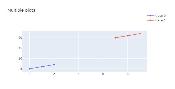 fig.add_trace(go.Scatter(x=[0, 1, 2], y=[5,6,7]), row=2, col=1) fig.add_trace(go.Scatter(x=[7,8,9], y=[20,21,22]), row=2, col=1)