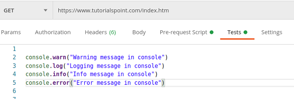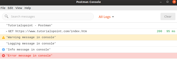 在 Postman 控制台中,我们可以按日志、信息、警告和错误过滤控制台输出消息。我们还可以使用清除按钮删除之前的日志。