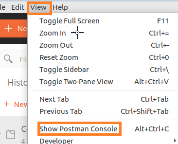 可以通过以下导航从 Postman 应用程序获得控制台:查看菜单>显示 Postman 控制台。或者使用快捷方式 Ctrl+Alt+C。