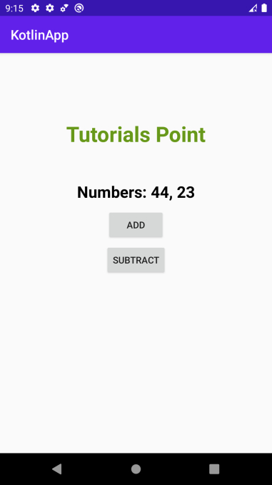 <?xml version="1.0" encoding="utf-8"?> <LinearLayout xmlns:android="http://schemas.android.com/apk/res/android" xmlns:tools="http://schemas.android.com/tools" android:layout_width="match_parent" android:layout_height="match_parent" android:gravity="center_horizontal" android:orientation="vertical" tools:context=".MainActivity"> <TextView android:layout_width="wrap_content" android:layout_height="wrap_content" android:layout_marginTop="100dp" android:layout_marginBottom="50dp" android:text="Tutorials Point" android:textAlignment="center" android:textColor="@android:color/holo_green_dark" android:textSize="32sp" android:textStyle="bold" /> <TextView android:id="@+id/textViewNumbers" android:layout_width="wrap_content" android:layout_height="wrap_content" android:text="Numbers: " android:textColor="@android:color/black" android:textSize="24sp" android:textStyle="bold" /> <Button android:id="@+id/buttonAdd" android:layout_width="wrap_content" android:layout_height="wrap_content" android:layout_marginTop="10dp" android:text="add" /> <Button android:id="@+id/buttonSubtract" android:layout_width="wrap_content" android:layout_height="wrap_content" android:layout_marginTop="5dp" android:text="subtract" /> </LinearLayout>