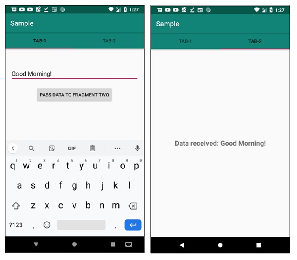 <ScrollView xmlns:android="http://schemas.android.com/apk/res/android" android:layout_width="match_parent" android:layout_height="wrap_content" android:fillViewport="true"> <RelativeLayout android:layout_width="match_parent" android:layout_height="wrap_content"> <EditText android:id="@+id/passMessage" android:layout_width="match_parent" android:layout_height="wrap_content" android:layout_above="@+id/btnPassData" android:layout_margin="16dp" android:hint="Enter here" /> <Button android:id="@+id/btnPassData" android:layout_width="wrap_content" android:layout_height="wrap_content" android:layout_centerInParent="true" android:text="PASS DATA TO FRAGMENT TWO" /> </RelativeLayout> </ScrollView>