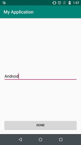 <?xml version = "1.0" encoding = "utf-8"?> <RelativeLayout xmlns:android = "http://schemas.android.com/apk/res/android" xmlns:tools = "http://schemas.android.com/tools" android:layout_width = "match_parent" android:layout_height = "match_parent" android:layout_margin = "16dp" android:orientation = "vertical" tools:context = ".SecondActivity"> <EditText android:id = "@+id/edit_text" android:layout_width = "match_parent" android:layout_height = "wrap_content" android:layout_centerInParent = "true" android:layout_gravity = "center" android:hint = "Enter something to return previous activity" android:inputType = "text" /> <Button android:id = "@+id/button" android:layout_width = "match_parent" android:layout_height = "wrap_content" android:layout_alignParentBottom = "true" android:layout_gravity = "center" android:layout_marginTop = "16dp" android:text = "Done" /> </RelativeLayout>