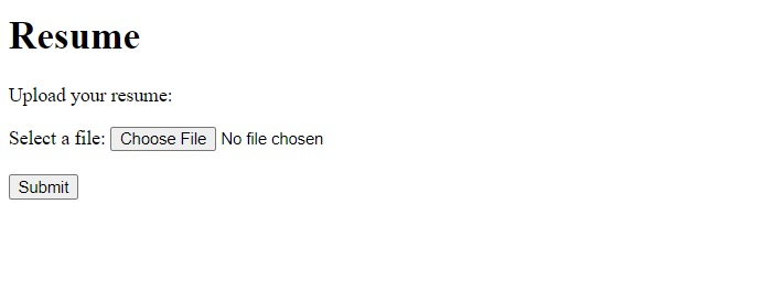 <!DOCTYPE html> <html> <body> <h1>Resume</h1> <p>Upload your resume:</p> <form action="/details.php"> <label for="myfile">Select a file:</label> <input type="file" id="myfile" name="myfile" multiple><br><br> <input type="submit"> </form> </body> </html>