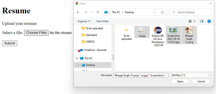 这允许用户上传多个文件。在输入类型中设置multiple属性,按钮将显示选择文件用于选择多个文件: