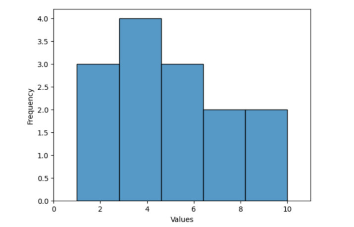 在以下示例中,我们将展示如何使用内置方法 histplot() 绘制直方图,该方法接受名为 data 的变量作为参数,该变量包含随机数据,并使用 xlabel() 和 ylabel() 等内置函数分别在水平和垂直轴上设置文本名称。然后使用 xlim() 和 ylim() 分别获取 x 轴和 y 轴上整数的范围限制。最后,它将使用 show() 方法获取程序的输出。