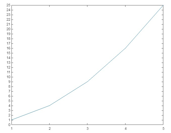 % MATLAB program to specify custom axis tick values % Create a sample vector of data x = linspace(1, 5, 5); y = x.^2; % Plot the x and y data on graph plot(x, y); % Specify the custom tick values of the X and Y axes xticks(1:5); yticks(0:25);