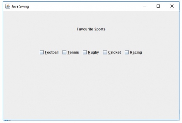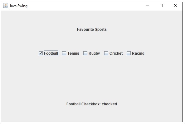 现在,按下为复选框设置的键。假设首先对于足球,我们将按下 Alt+F,因为我们在代码中设置了相同的内容(setMnemonic(KeyEvent.VK_F))