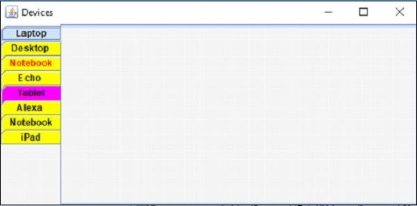 若要设置 JTabbedPane 容器中标签的位置,可以使用 LEFT 常量。此处,我们将位置设置为左侧 -