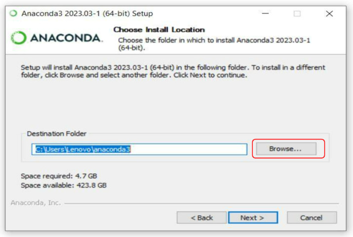 步骤 4 - 选择浏览选项以设置 Anaconda 的位置。