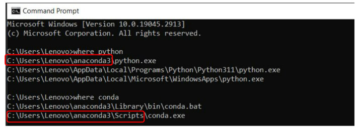 步骤 9 - 现在打开命令提示符并提及名为 where python 和 where conda 的命令以获取路径的详细信息。