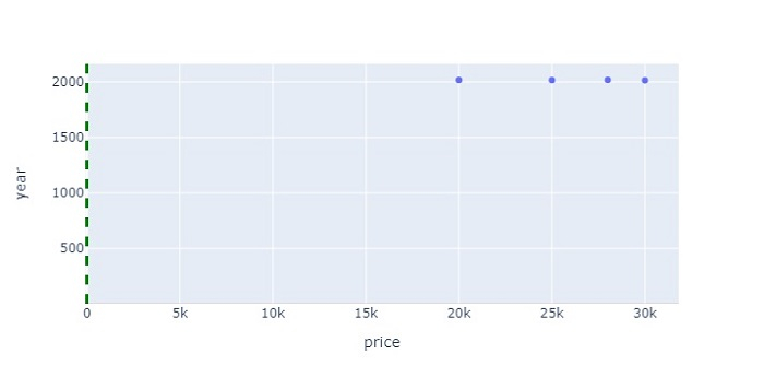 import plotly.express as px import pandas as pd data = { 'model':['moto','sony','samsung','redmi'], 'price':[20000,25000,30000,28000], 'year':[2018,2017,2015,2019] } df = pd.DataFrame(data) fig = px.scatter(df, x=df['price'], y=df['year']) fig.add_vline(x=2.5, line_width=3, line_dash="dash", line_color="green") fig.add_hrect(y0=0.9, y1=2.6, line_width=0, fillcolor="red", opacity=0.7) fig.update_layout(width=716, height=365) fig.show()