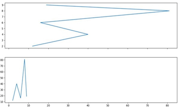 import matplotlib.pyplot as plt x = [2, 4, 6, 8, 9] y = [12, 40, 16, 81, 19] ax1 = plt.subplot(211) ax2 = plt.subplot(212) ax1.plot(y, x) ax2.plot(x, y) ax1.get_shared_x_axes().join(ax1, ax2) ax1.set_xticklabels([]) plt.show()