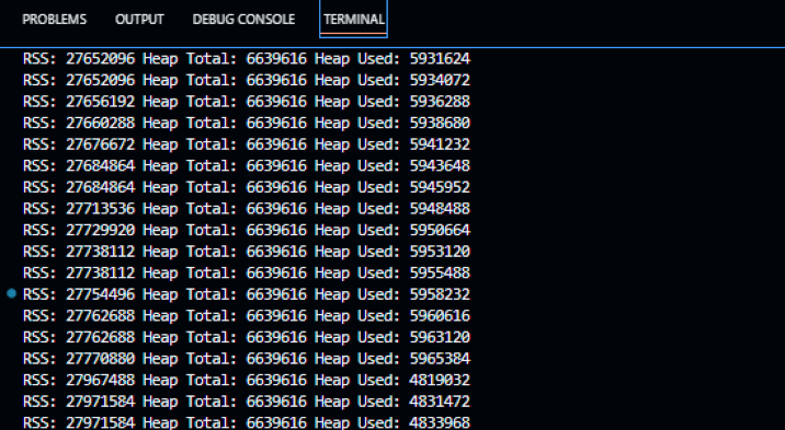步骤 5 - 我们每秒将内存使用情况统计信息记录到控制台中,以便我们可以查看内存使用情况如何随时间变化