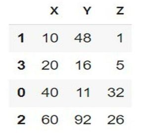 在以下示例中,通过导入名为 pandas 的模块开始程序,该模块将对象引用设置为 pd。然后使用字典数据类型设置三个列,即 X、Y 和 Z,并将其存储在变量 col 中。接下来,使用 pandas 模块的 DataFrame 并将其存储在一个名为 df 的新变量中。现在使用内置方法 sort_values 按升序对行进行排序,该方法遵循序列或项目,并将其存储在变量 sorted_df 中。然后只需编写 sorted_df 即可获得表格输出作为结果。