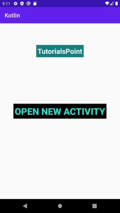 <?xml version="1.0" encoding="utf-8"?> <RelativeLayout xmlns:android="http://schemas.android.com/apk/res/android" android:layout_width="match_parent" android:layout_height="match_parent" android:padding="4dp"> <TextView android:layout_width="wrap_content" android:layout_height="wrap_content" android:layout_centerHorizontal="true" android:layout_marginTop="70dp" android:background="#008080" android:padding="5dp" android:text="TutorialsPoint" android:textColor="#fff" android:textSize="24sp" android:textStyle="bold" /> <Button android:id="@+id/button" android:layout_width="wrap_content" android:layout_height="wrap_content" android:layout_centerInParent="true" android:background="@android:color/background_dark" android:padding="4dp" android:text="Open New Activity" android:textColor="@color/colorAccent" android:textSize="32sp" android:textStyle="bold" /> </RelativeLayout>