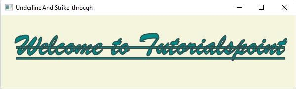 **javafx.scene.text.Text** 类的 **删除线** 属性确定文本的每一行是否应该有一条直线穿过它的中间。您可以使用 **setStrikeThrough()** 方法为此属性设置值。它接受布尔值。您可以通过将 true 作为参数传递给此方法来删除文本(节点)。