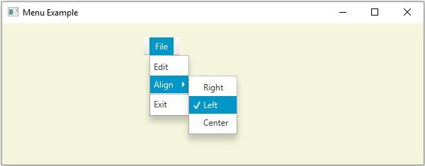 RadioMenuItem sub3 = new RadioMenuItem("Center");