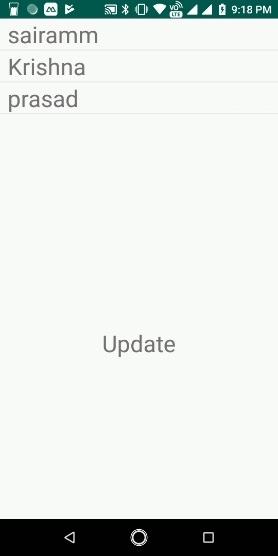 <?xml version = "1.0" encoding = "utf-8"?> <LinearLayout xmlns:android = "http://schemas.android.com/apk/res/android" android:orientation = "vertical" android:layout_width = "match_parent" android:gravity = "center" android:layout_height = "wrap_content"> <android.support.v7.widget.RecyclerView android:id = "@+id/recycler_view" android:layout_width = "match_parent" android:layout_height = "400dp" android:scrollbars = "vertical" /> <TextView android:id = "@+id/text" android:textSize = "30sp" android:text = "Update" android:layout_width = "wrap_content" android:layout_height = "wrap_content" /> </LinearLayout>