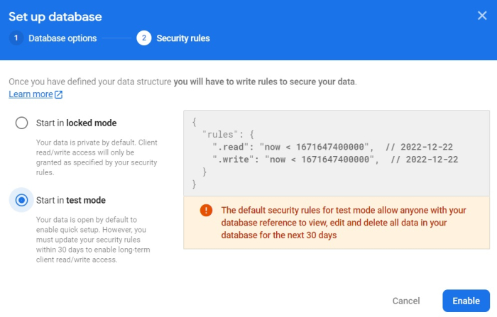 步骤9 − 点击创建数据库。选择实时数据库位置并点击下一步。