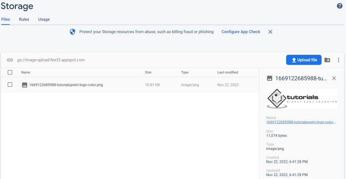 上传图片后,转到Firebase页面并点击“文件”以刷新。这是我们上传到Firebase的图片。