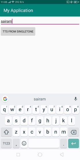 <?xml version = "1.0" encoding = "utf-8"?> <LinearLayout xmlns:android = "http://schemas.android.com/apk/res/android" xmlns:tools = "http://schemas.android.com/tools" android:layout_width = "match_parent" android:layout_height = "match_parent" tools:context = ".MainActivity" android:orientation = "vertical"> <EditText android:id = "@+id/editText" android:hint = "Write here what to speak " android:layout_width = "match_parent" android:layout_height = "wrap_content" /> <Button android:id = "@+id/show" android:text = "TTS from singleTone" android:layout_width = "wrap_content" android:layout_height = "wrap_content" /> </LinearLayout>