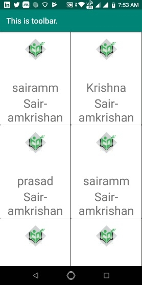 <?xml version = "1.0" encoding = "utf-8"?> <android.support.v7.widget.CardView xmlns:android = "http://schemas.android.com/apk/res/android" xmlns:app = "http://schemas.android.com/apk/res-auto" xmlns:tools = "http://schemas.android.com/tools" android:layout_width = "match_parent" android:layout_height = "wrap_content" app:cardElevation = "10dp" app:cardCornerRadius = "20dp" tools:context = ".MainActivity"> <LinearLayout android:layout_width = "match_parent" android:layout_height = "wrap_content" android:gravity = "center" android:orientation = "vertical"> <ImageView android:id = "@+id/imageView2" android:layout_width = "wrap_content" android:layout_height = "wrap_content" android:src = "@drawable/logo" /> <TextView android:id = "@+id/title" android:layout_width = "match_parent" android:layout_height = "wrap_content" android:gravity = "center" android:textSize = "30sp" /> <TextView android:id = "@+id/textview2" android:layout_width = "match_parent" android:layout_height = "wrap_content" android:gravity = "center" android:text = "Sairamkrishan" android:textSize = "30sp" /> </LinearLayout> </android.support.v7.widget.CardView>