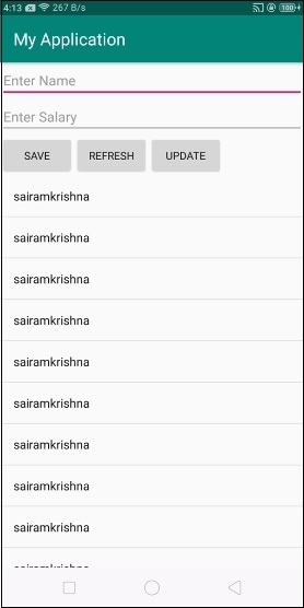 在上面的代码中,我们使用了姓名和薪水作为EditText,当用户点击保存按钮时,它会将数据存储到SQLite数据库中。插入值后,点击刷新按钮以使用游标LIKE子句更新ListView。如果用户点击更新按钮,它将使用薪水更新数据。