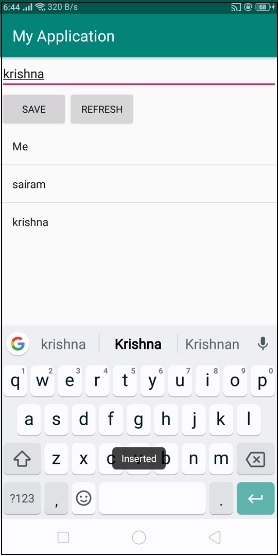 在以上代码中,我们已将名称和记录编号作为编辑文本,当用户单击保存按钮时,它将数据存储到 ArrayList 中。单击刷新按钮以获取列表视图的更改。